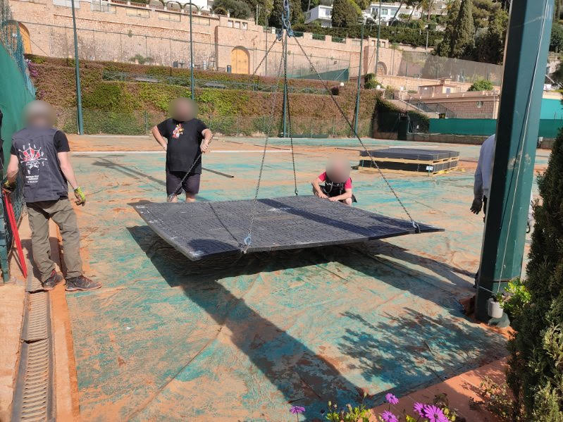 • Recouvrement préalable de deux courts de tennis avec des bâches de protection spécifiques (du même type que celles utilisées en cas de pluie) pour préserver les surfaces sportives