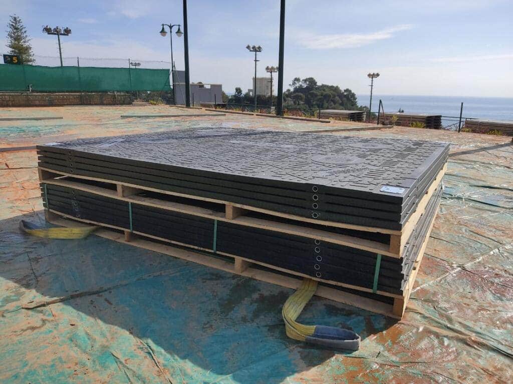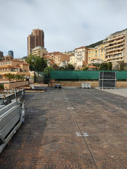 • Pose des plaques directement sur les bâches, formant une plateforme stable capable de supporter des structures événementielles lourdes telles que des chapiteaux