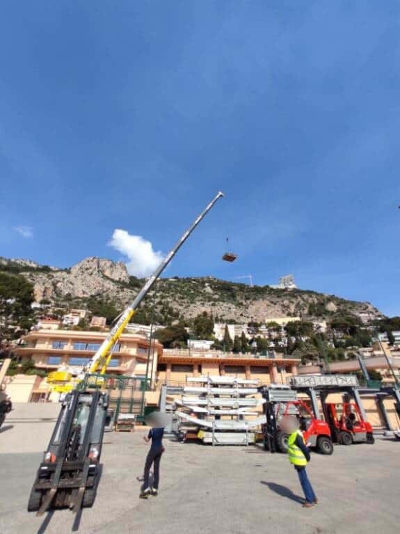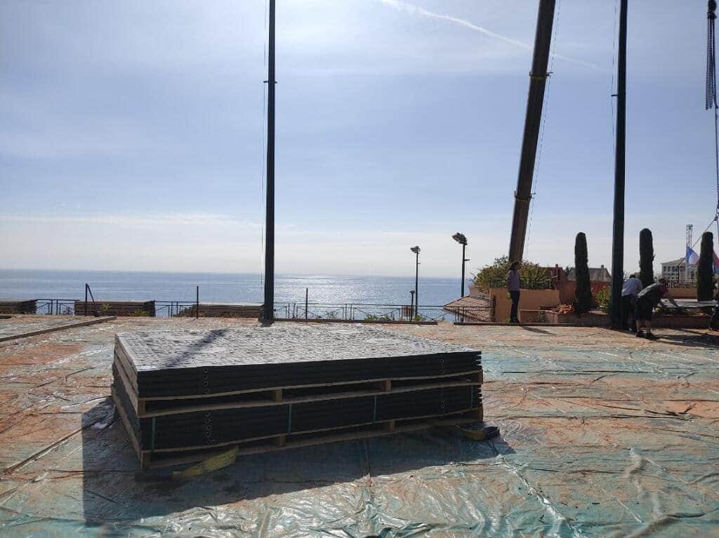 Le site du tournoi, situé sur les hauteurs de Roquebrune-Cap-Martin (06), ne permettait pas un accès classique par la route ou les chemins pour acheminer le matériel nécessaire à l’installation des structures événementielles.
