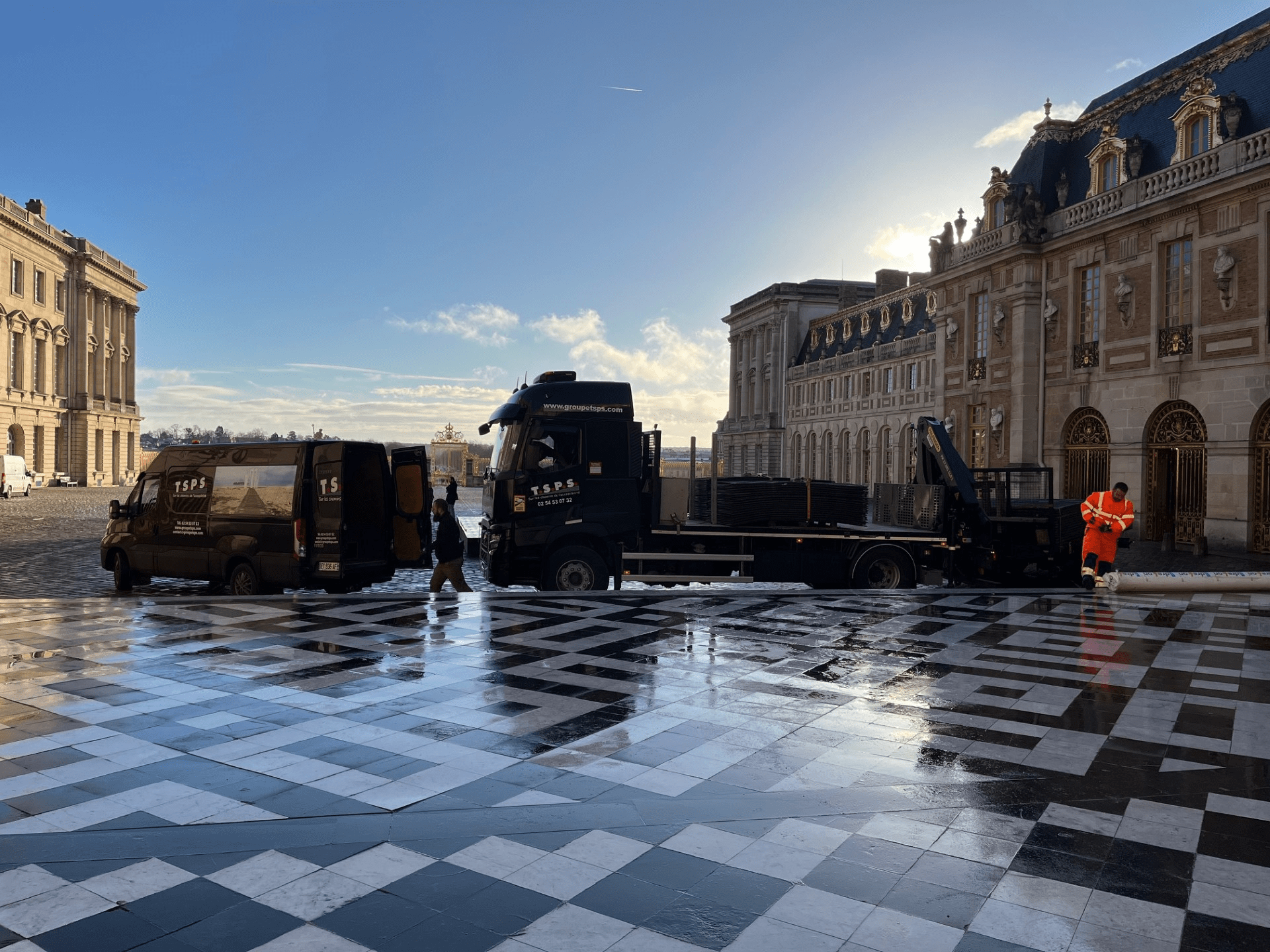 La cour de marbre, connue pour son sol en mosaïque noire et blanche d’une grande valeur historique, nécessite une attention toute particulière lors des interventions. Pour garantir la préservation de ce site prestigieux, nous avons donc déployé nos plaques de protection conçues pour sécuriser les sols sensibles tout en permettant le passage des engins et du matériel de maintenance.